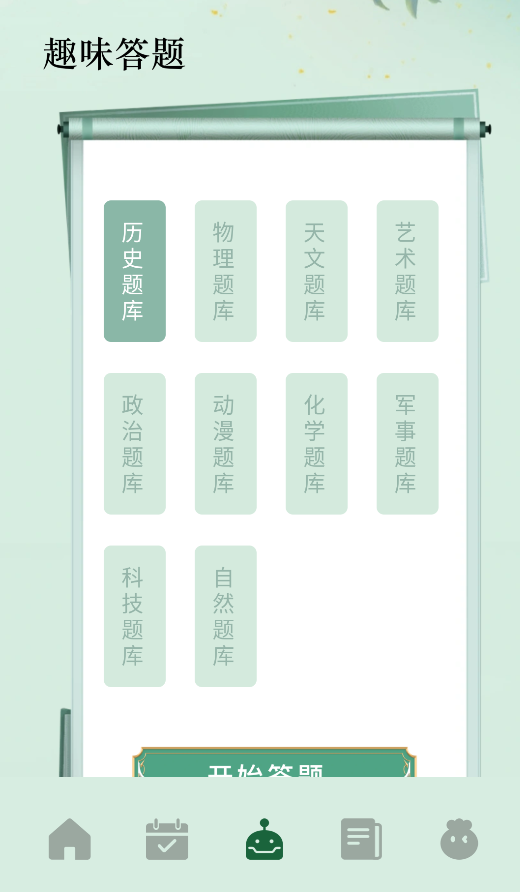 4、答题互动操作指南:选择题目知识类型→回答趣味问题→查看专业解析→收藏重点错题集。