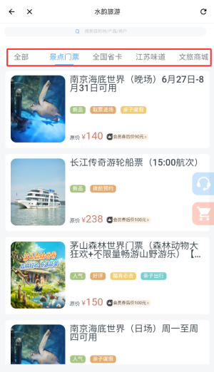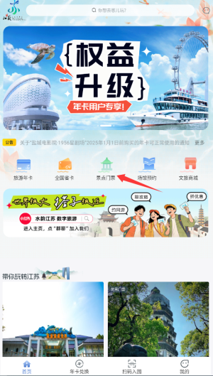1、进入水韵旅游APP后,在首页导航栏选择"景点门票"选项,进入景区列表页面。