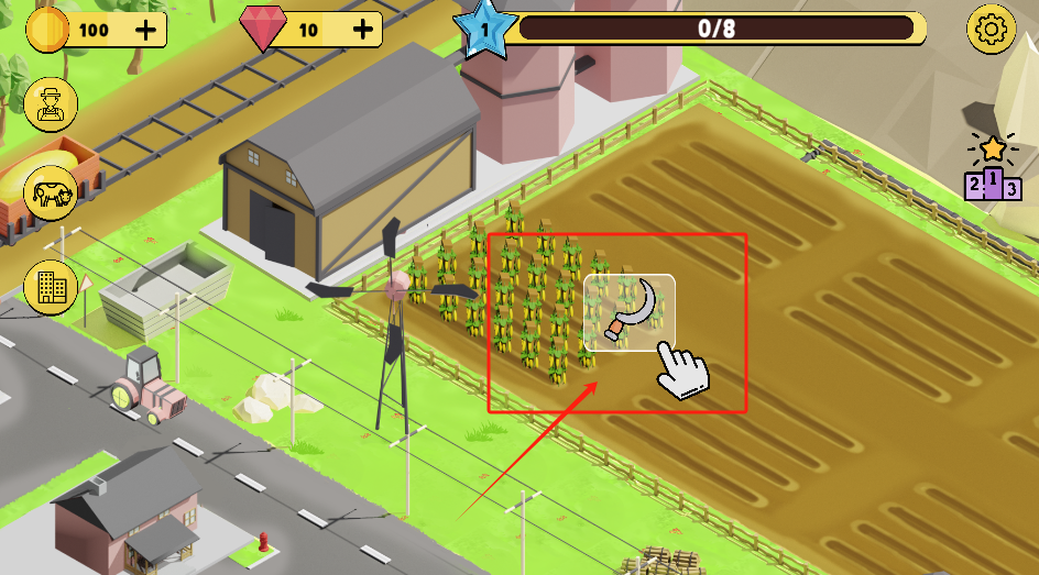 3、等作物成熟后,点镰刀图标收割,注意看任务进度和资源数量。