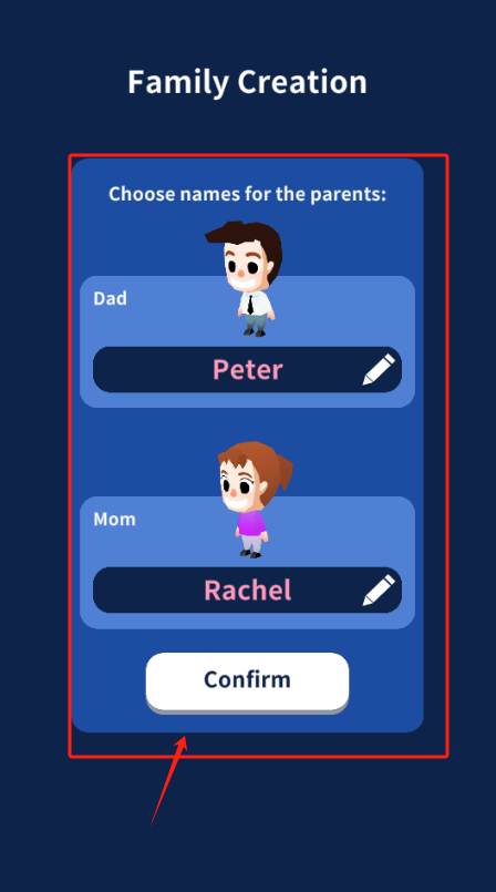 1、给爸爸取名Peter,妈妈取名Rachel,点右下角Confirm确认创建家庭。