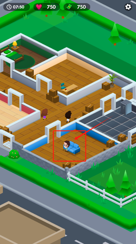 3、7点50分,观察房子内部,点击蓝色沙发上的人物互动,查看资产情况。