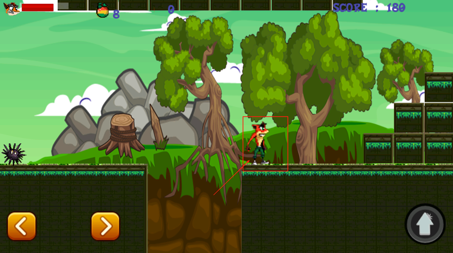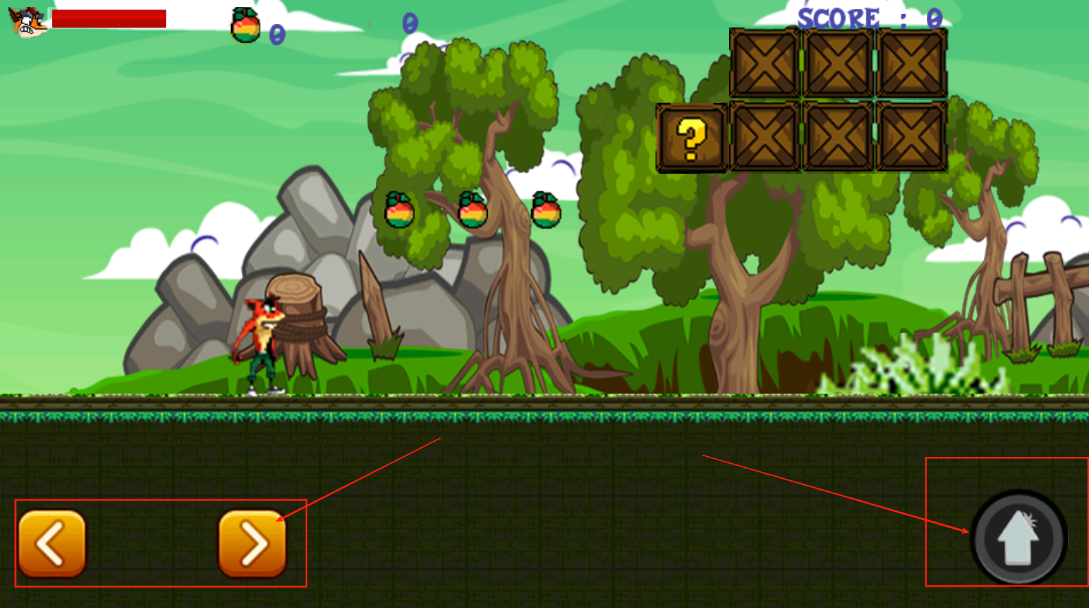 2、用底下左右箭头移动角色,点右边按钮跳跃吃水果,问号箱能顶。