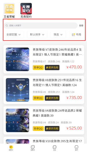 1、智能搜索支持按游戏、段位、皮肤数量等条件筛选,快速找到心仪账号,支持多账号对比。
