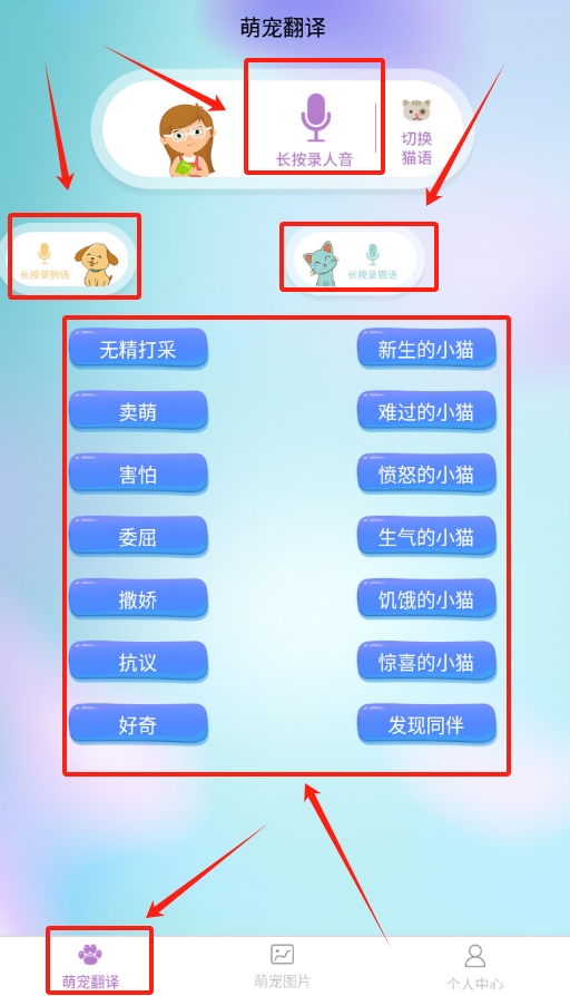 1、运用专业音频分析技术,像侦探一样精准剖析你的声音,巧妙转化成地道猫语狗语,轻松吸引毛孩子注意力。