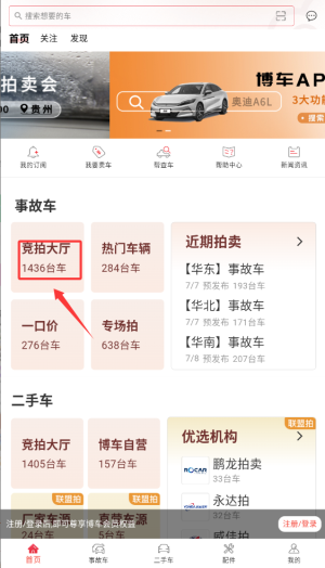 1、启动博车网拍卖APP后,在首页点击"竞拍大厅"选项,进入拍卖专场列表。