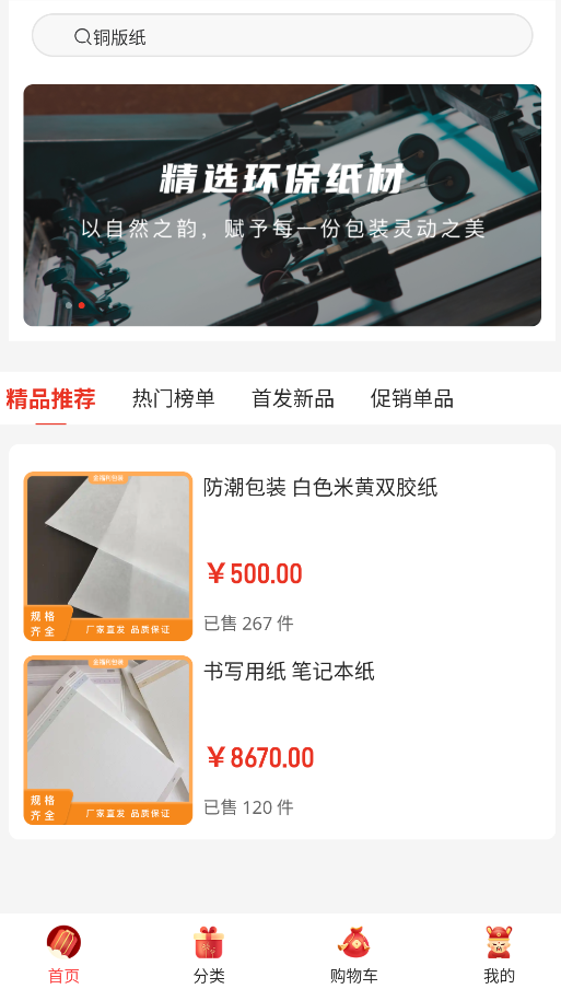 1、打开APP后,首页会展示精选包装产品推荐,包括热销榜单、新品首发和限时促销等特色商品专区。