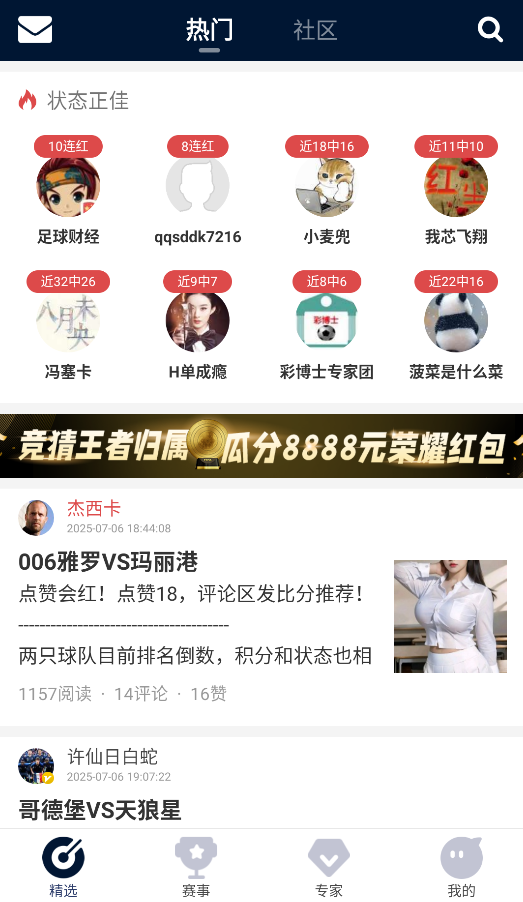 1、打开APP后,首页"精选"板块会推送热门赛事分析和社区热议话题,随时掌握体坛动态。