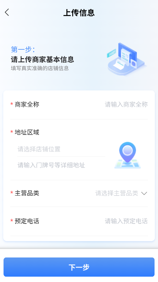 2、按要求填写店铺详细信息,输入商家全称,地址区域,主营品类,预定电话。