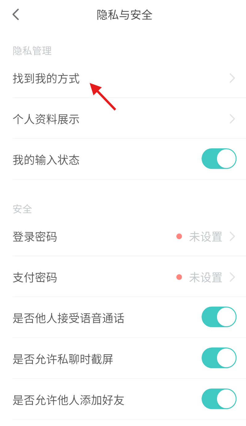3、于 “隐私与安全” 设置中,找到 “找到我的方式” 选项并点击,进入查找方式管理页面。