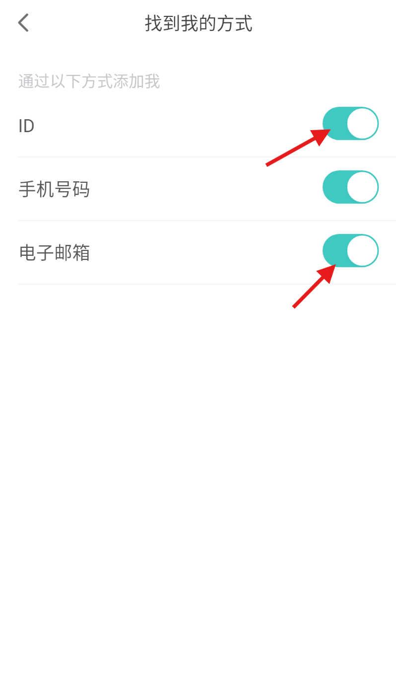 4、在 “找到我的方式” 页面,点击 ID 和电子邮箱对应开关,将其关闭,仅保留手机号查找途径。