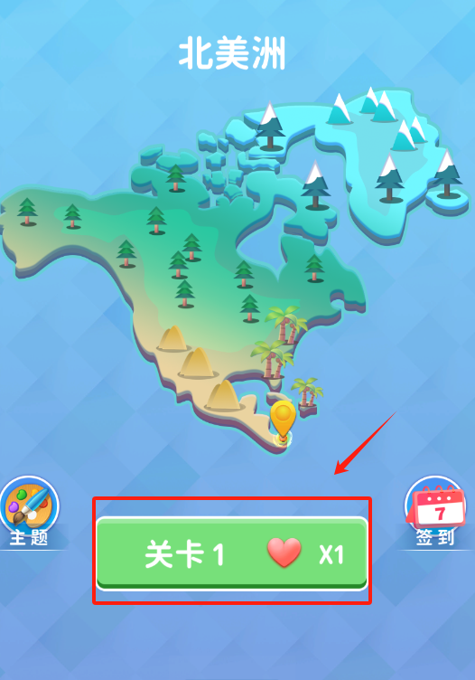 1、看到红色框里的绿色关卡1按钮,用手指点这个按钮,就能开始北美洲主题的闯关游戏啦。