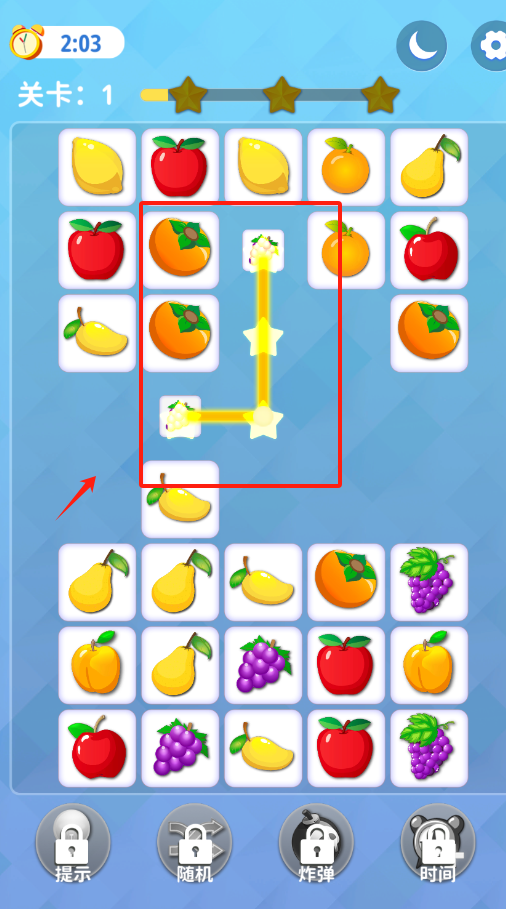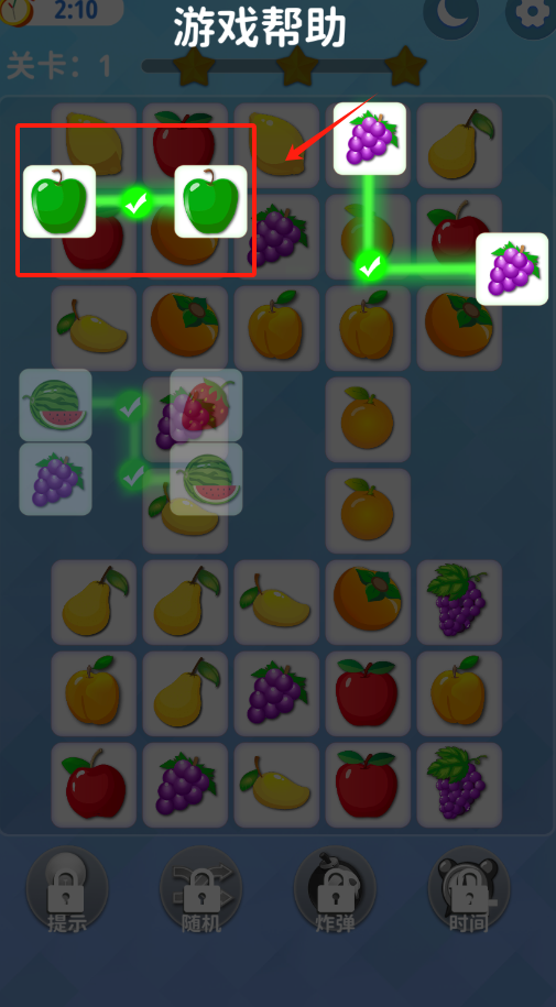3、看到黄色光线连着的两颗星星,用手指点这条光线上的水果,就能消除障碍拿到三星评分呀。