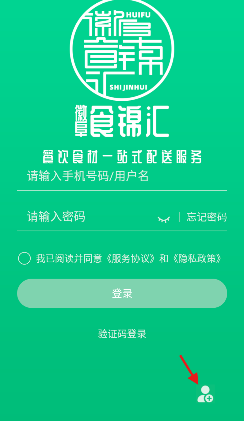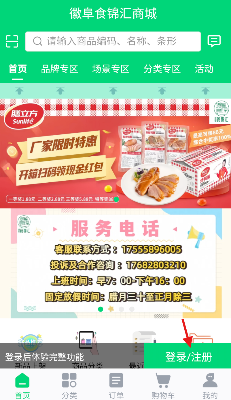 1、打开徽阜食锦汇软件后,在导航栏的上方位置找到登录 / 注册选项并点击进入相关页面。