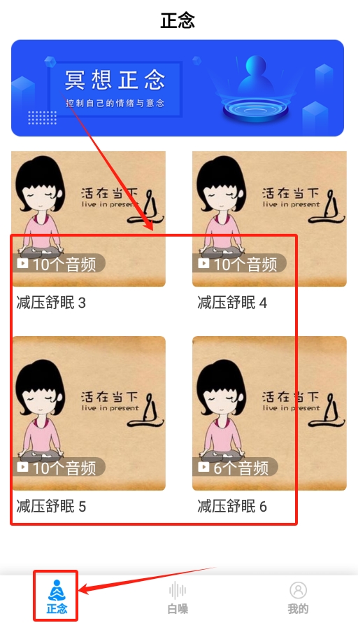 2、登录后回到正念页面,这里有各种放松音乐,选一首喜欢的点开播放,听着就能慢慢放松下来缓解压力。