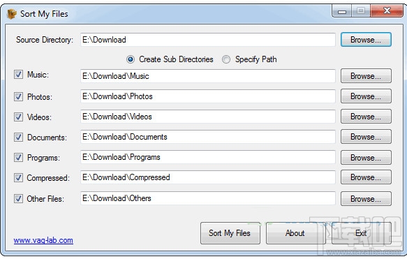 首先在 Sort My Files 的 Source Directory 中选定该文件夹,默认会在该文件夹下生成相应类型的子文件夹。当然,你也可以将一个文件夹内的文件分类的其它文件夹内,比如库中的相应文件夹,Sort My Files 都可以做到。