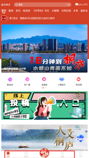 1、深耕桐庐本地化服务,平台整合县域内政务、民生、文化等多维度资源,打造"新闻+服务"一体化平台。