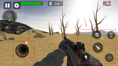 2、左侧是移动控制区域,右侧则是射击、换弹与技能按钮,界面顶部显示当前血量与弹药情况。