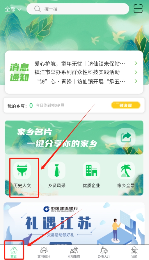 1、打开裕建乡村振兴后,在软件首页上找到历史人文的选项,直接点击进去,进入到相关的页面准备查看内容。