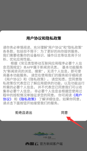 1、启动西盟云APP后,首次使用需阅读用户协议和隐私政策,点击右下角"同意"按钮进入。