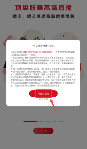 1、启动球竞APP后,首次使用需点击确认同意隐私协议条款,进入直播主界面。