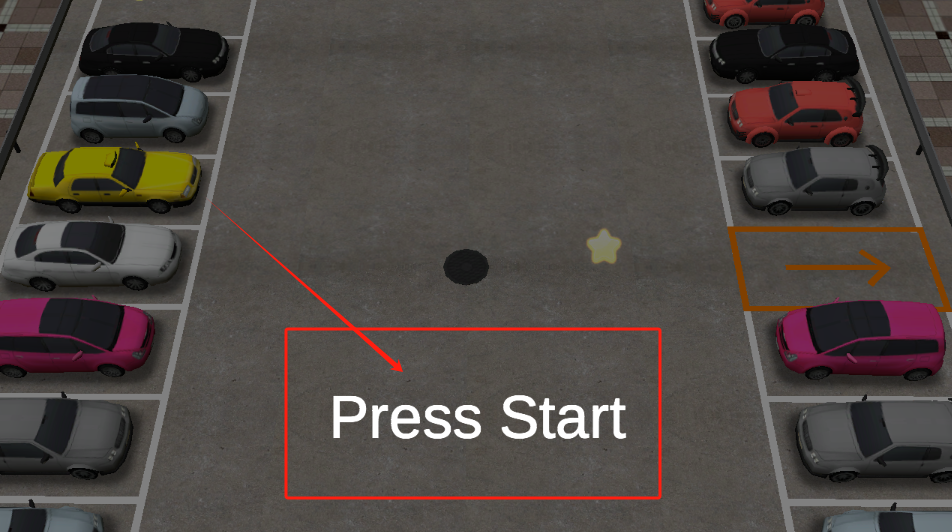 2、按中间红色START按钮开始游戏,跟着黄色箭头方向把车开到指定位置吧。