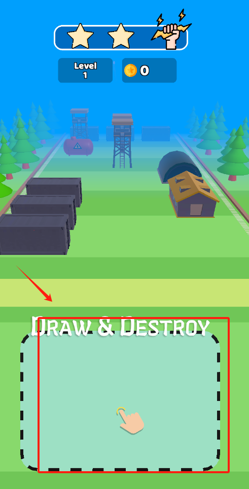 1、看到手形图标和关卡1,用手指点那块手形区域,就能开始画画摧毁游戏啦。