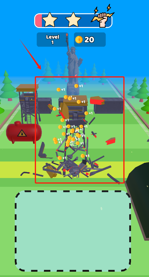 2、看到红色油桶和闪电图标,点那个红色方框里的废墟,就能触发爆炸赚金币哟。