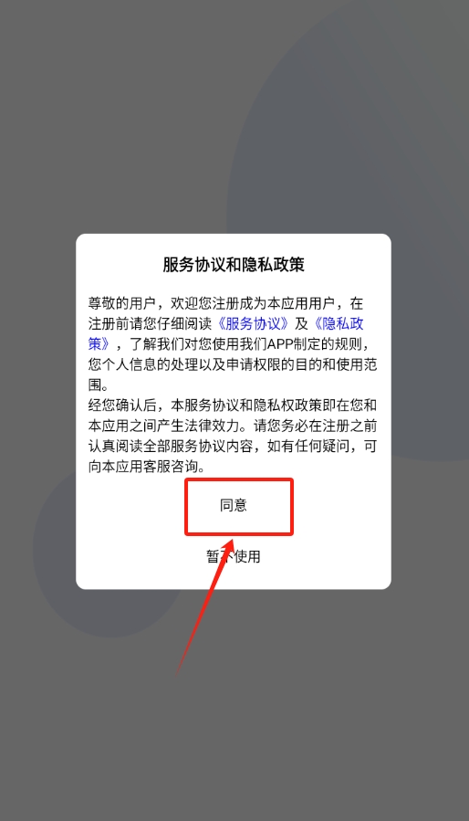 1、打开地信宝招聘后,首先会看到软件协议,点击同意,这样才能继续后面的操作,进入到登录注册页面。