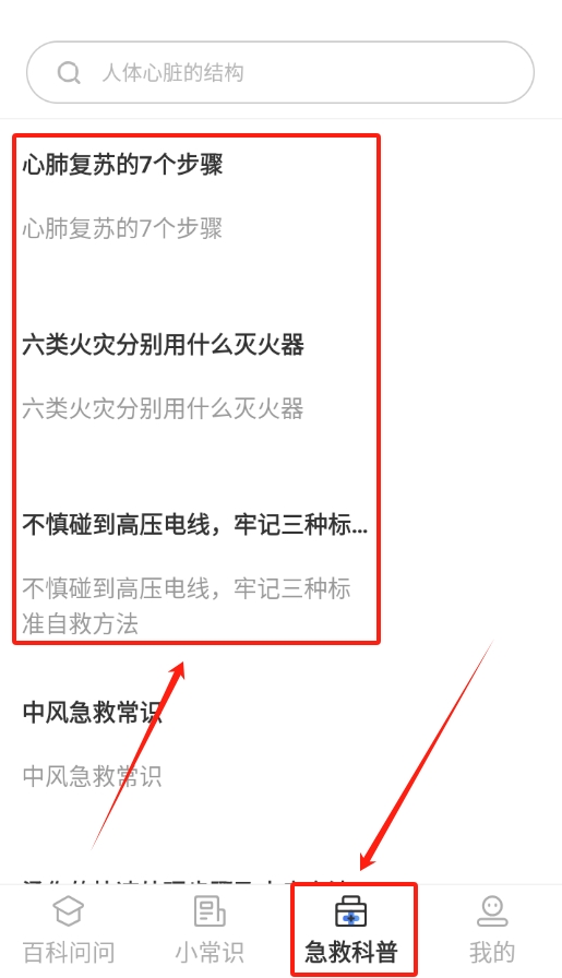 4、要是想了解急救方面的知识,点开急救科普页面,里面有各种紧急情况下的处理方法,讲解得很详细。