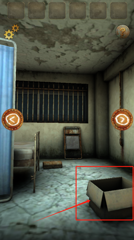2、左右箭头按钮切换场景,齿轮和问号图标可能藏线索,注意病床和铁栏杆细节。