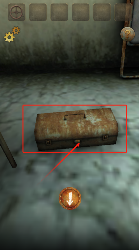 4、按箭头指向地面互动图标,锈蚀铁箱是重点,灰色槽位可能用来存放找到的工具。
