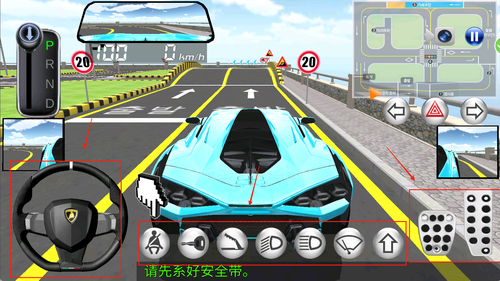 2、左侧控制方向盘调整方向,右侧为油门与刹车按钮,同时支持灯光、换挡等细节操作。