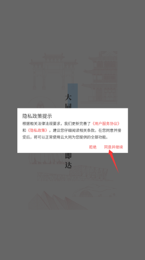 1、启动云大同APP后,首次使用需阅读并同意用户协议和隐私政策,点击确认进入主界面。