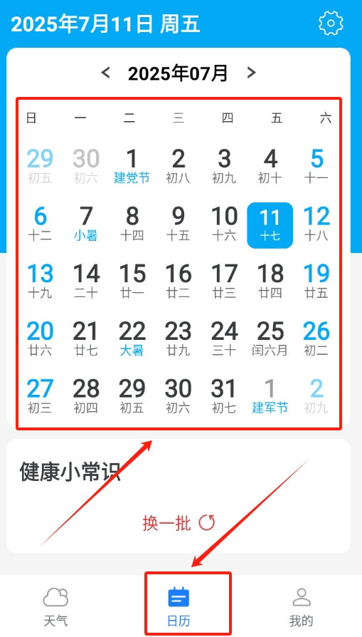 4、想查看日历相关内容,在软件里找到日历页面点击进入,能看到日期和对应的天气情况,方便结合日期做计划。
