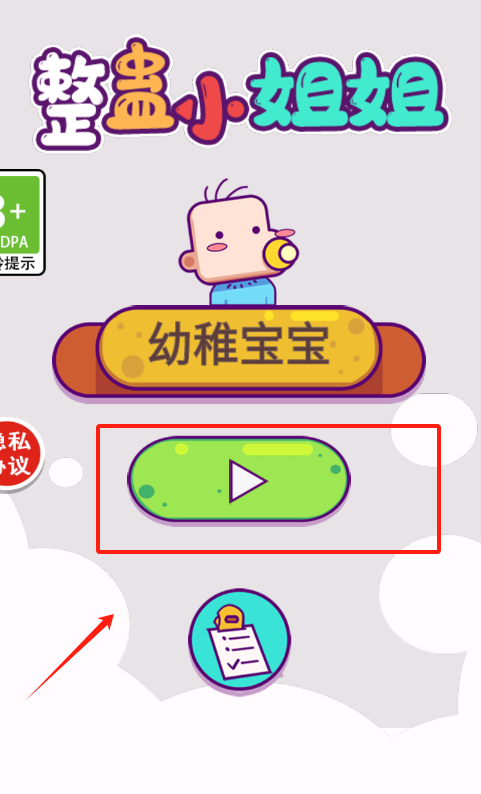 1、点绿色大按钮开始游戏,想选关卡就点左边黄色图标,隐私协议在左下角红圈里。