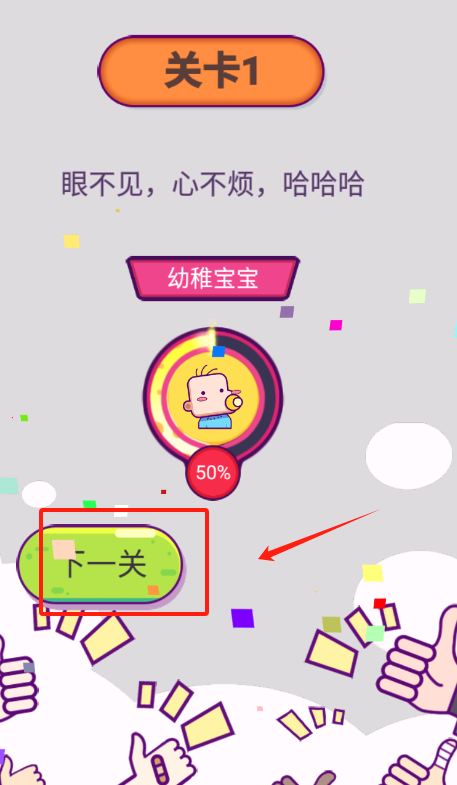 3、点底部绿色下一关按钮过关,屏幕中间婴儿会傻笑,右上角显示50%进度条。