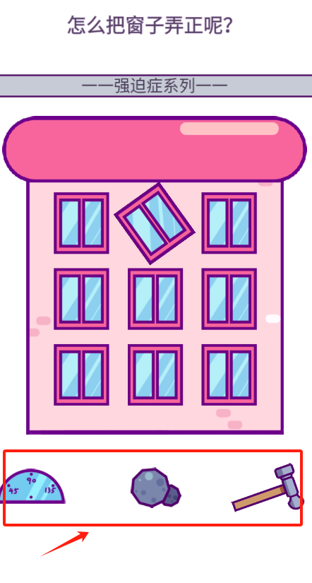 4、拖蓝色量角器到歪窗上调整角度,或用锤子砸正窗户,解决强迫症困扰。