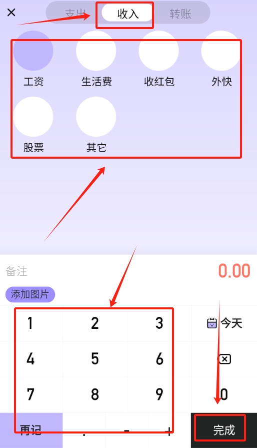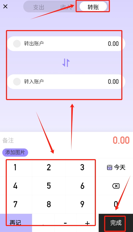 4、还可以记录转账,输入转出和转入的账户填好收入金额,最后点击完成即可。