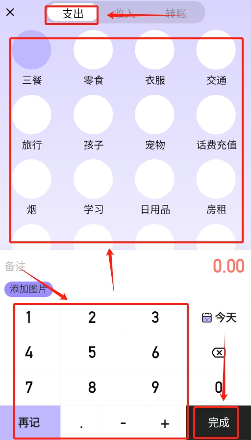 2、记账时输入消费金额,选择对应的分类,比如餐饮、交通等,还能添加备注,3 秒就能完成。