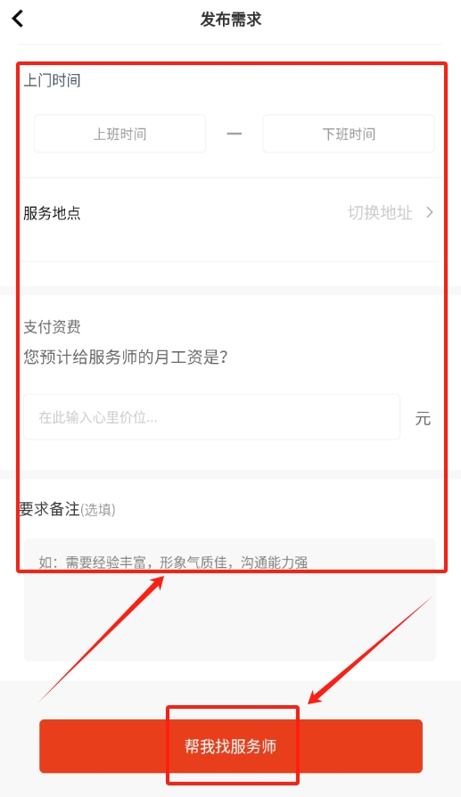 4、接下来输入上门时间、服务地点、工资等详细信息,确认没问题后点击帮我找服务师,就能发布需求等待回应了。