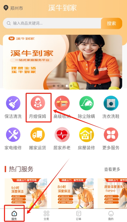 2、登录成功后,在首页上找到月嫂保姆的按键,直接点击进去,就能看到相关的服务信息和选项。