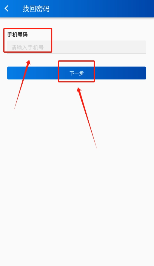 4、然后在新页面输入自己的手机号,点击下一步,之后按照页面上的要求一步步操作,就能找回密码了。