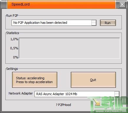 SpeedLord 操作:Run P2P 选择 你已经安装好的 P2P 软件,如:uTorrent ,然后点 Run,Network Adapter 选择你的网卡 , 点 status:accelerating 加速!