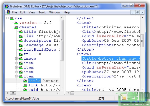 Firstobject XML editor是一个免费的XML编辑器,支持XML和HTML格式。加载大文件非常快,不需要java和MSXML的支持。支持高亮代码显示,支持UTF-16BOM和UTF-8格式。