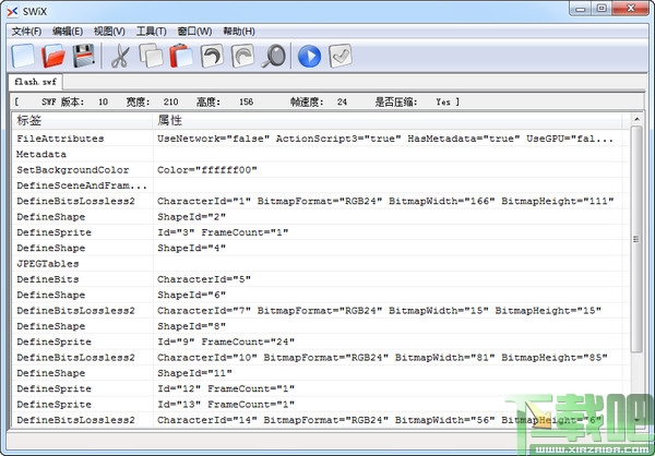 SWiX Free是一款SWF编辑工具,准确的说是一款调试、更新SWF文件的XML编辑器,SWiX可以将SWF文件反编译为SWIX的XML格式(SWiX-format XML),支持全系列Flash格式(Flash 5/6/7/8/9/10),反编译为XML格式会支持语法高亮,代码格式化及自动完成,还能预览修改过的SWF文件;最后SWiX能将SWIX XML格式重新编译为SWF文件。