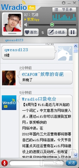 Wradio社交电台是全球新鲜、最时尚、最潮的电台语音分享交友社区平台,这是一个语音的世界,你可以用声音分享生活、用声音交朋友聊天、用声音体现你的个性。其自主运营创办的网络电台节目,包含全球新最热的美食、娱乐、生活、科技、新闻、旅游资讯,下载客户端即有美女主播与你语音互动