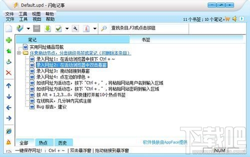简洁清爽的树形笔记管理软件。写日记,记笔记,收藏资料,保存网址书签,帮您填写网站密码;鼠标双击,即把笔记内容粘贴到输入窗口。