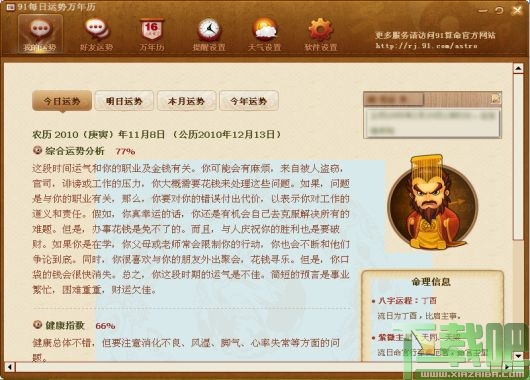 91每日运势万年历,是一款采用八字和紫微斗数为核心来计算个人流年运势,每月运势,每日运势,另外结合黄历每日宜忌,天气预报、好友生日提醒等诸多功能的桌面日历类软件。