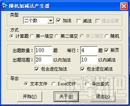 随机加减法产生器功能介绍:1.可以生成100以内的加减计算题、填空题、或随机出题2.可以按需要生成进位加法(默认)、无进位加法,退位减法(默认)、无退位减法3.可以将试题导出为Txt文档、Xls二种格式,导出试题文档中有当前试题的类型,一目了然