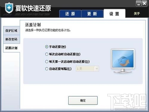 夏软快速还原,最快的一键还原! 根据需要设置还原计划,家庭和办公室建议设置手动还原,在需要时开机一键还原系统。网吧,酒店和学校公共机房等公共场所使用,建议设置为每次开机自动还原。 自动还原模式,计算机开机或者重启后,就会自动还原您的系统,不需要手动操作也不影响启动时间。 手动还原模式,当您系统出现问题或者系统垃圾文件过多运行变慢,需要还原时,可以在开机时按“R”键,一键还原系统。 无需备份:软件安装后重启即可,无需备份,节约装机时间。 还原最快:开机一键即完成还原,无还原过程,节省时间。 告别重装系统,一键还原,昨日重现。 网吧,学校机房,宾馆酒店,KTV,电脑初学者等需要开机自动还原系统的首选必装软件。 支持Win8,支持64位系统,支持GPT磁盘分区,支持超过2TB的大硬盘,支持UEFI主板安全启动,支持SSD Trim环境。
